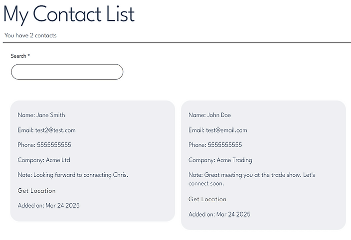 • My Contact List: The new contact’s shared information to include location data is added to your Contact List, providing LiNK members with valuable insights into where their contact information is gaining traction. Contact information is searchable by name, phone number, email or company data making your ability to quickly find connections simple. This ensures that even months after connecting, you can quickly remember and re-engage with key individuals.